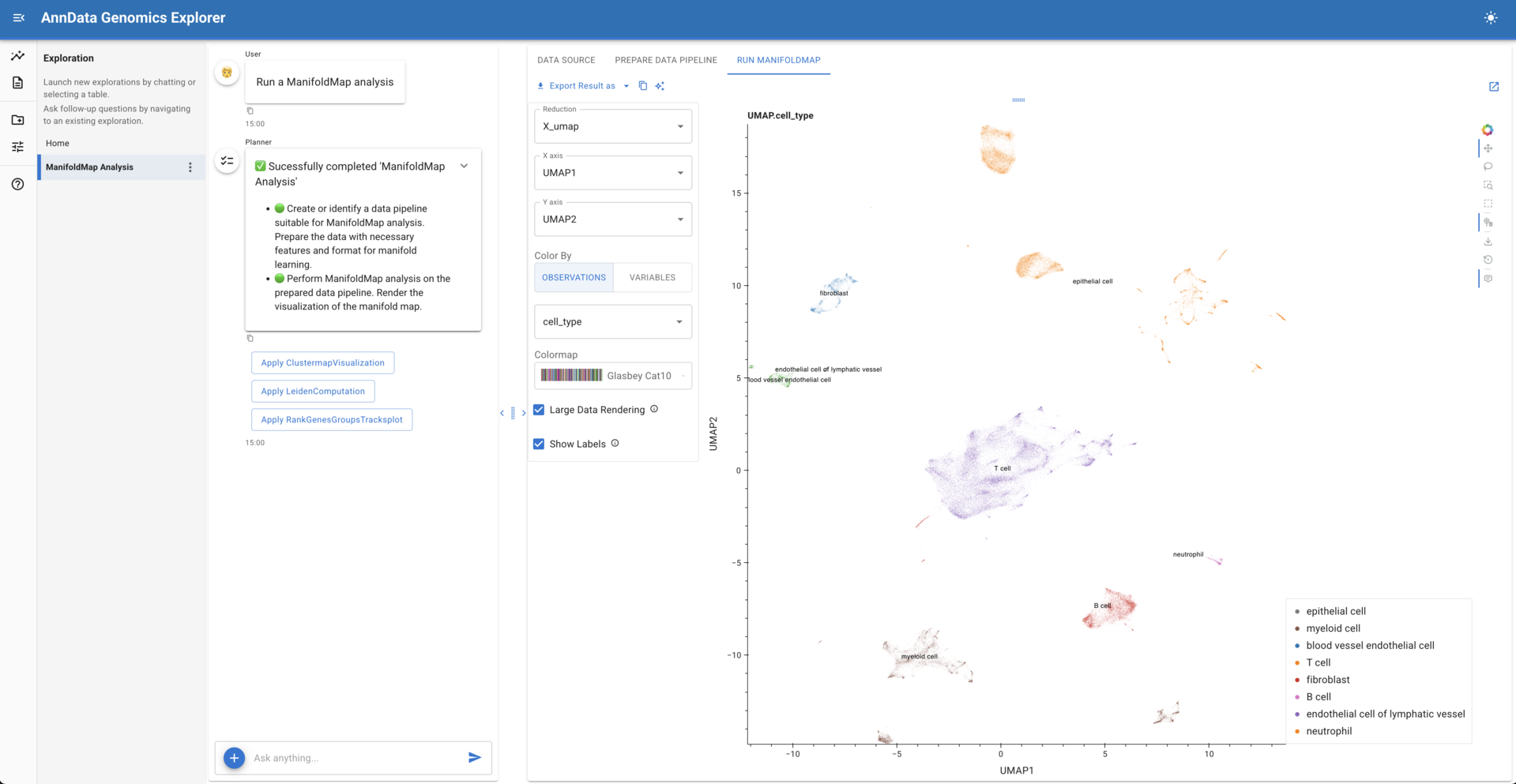 - Rich, specialized visual outputs, including complex UMAP embeddings rendered directly within the Lumen UI and composed alongside tables, metadata, and narrative context
