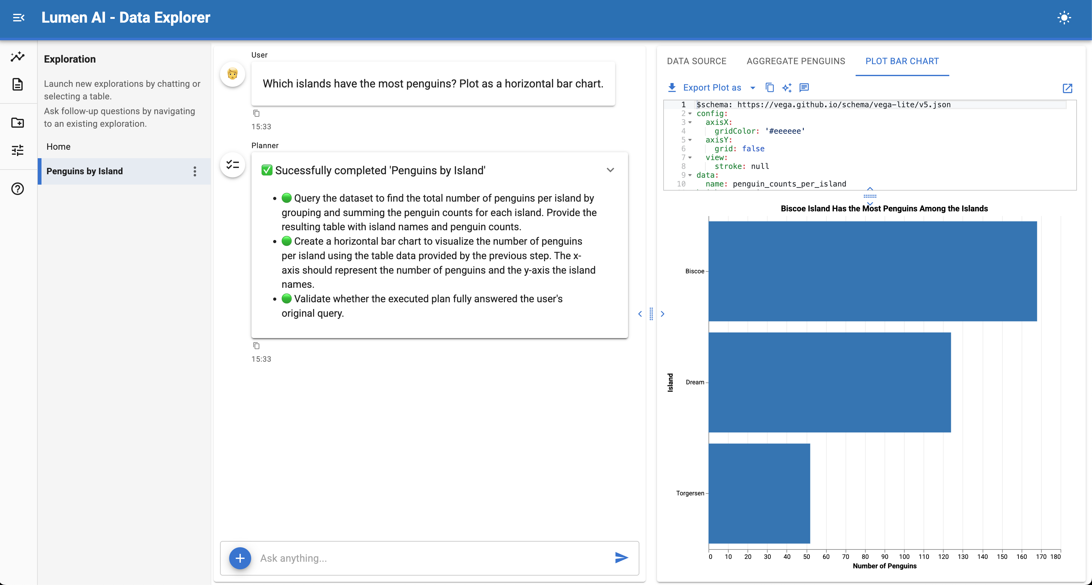 VegaLiteAgentgenerates a Vega-Lite specification to visualize the data if needed. The specification is human-readable, visible, and editable, just like the SQL.Iterate conversationally You can refine the analysis with follow-up questions—filter a category, change the aggregation, or add a comparison—and Lumen updates only the affected steps.